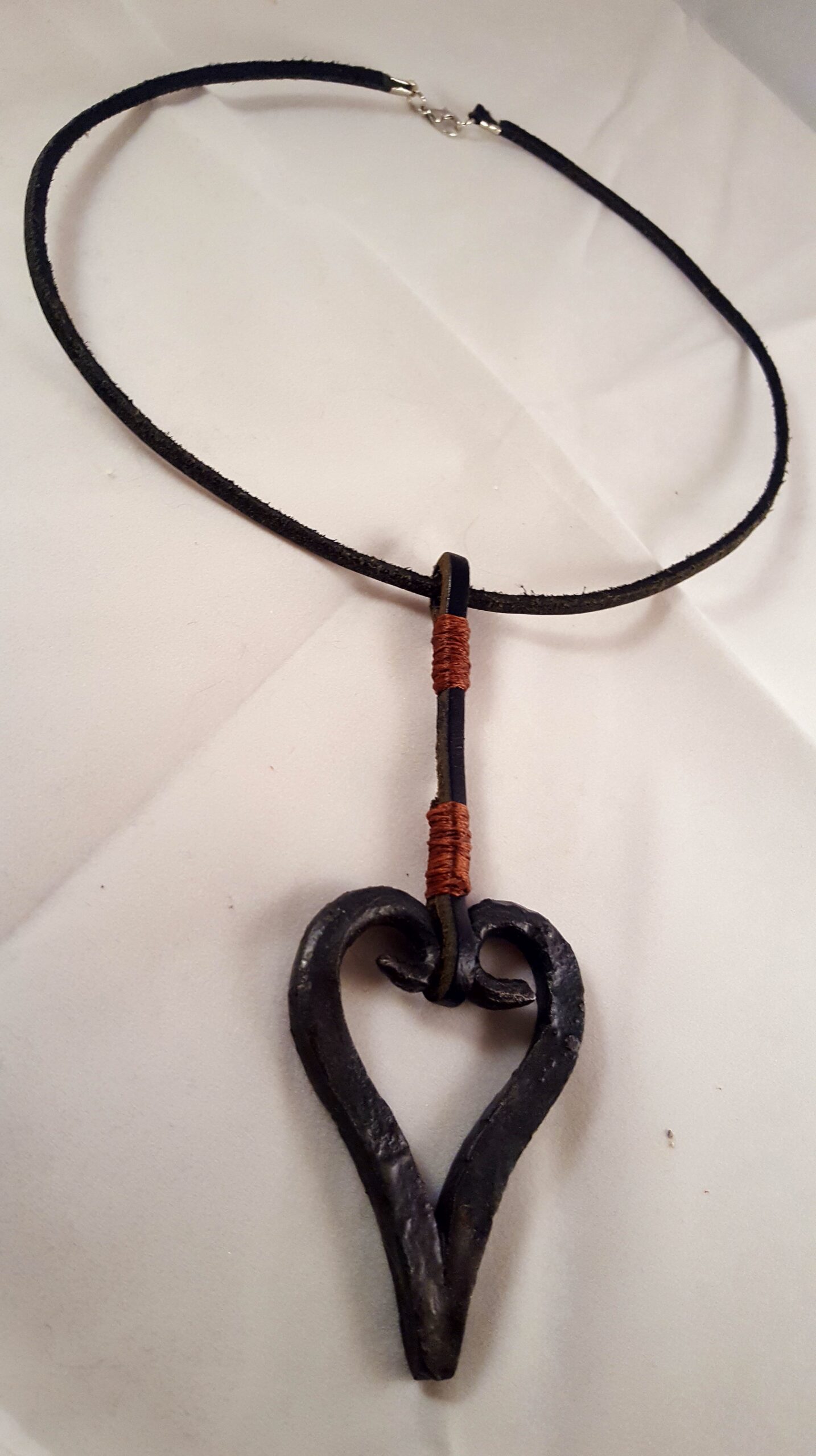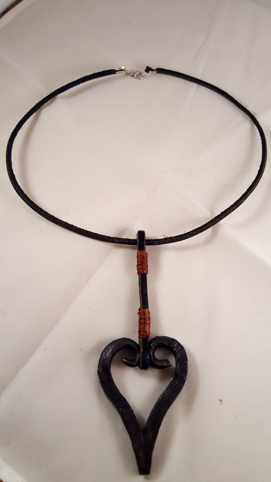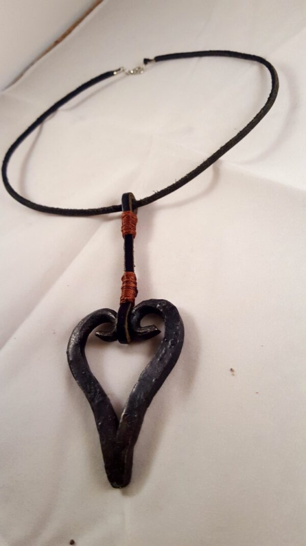 Created in the forge with mild steel this heart pendant is hammered and bent in to shape. Whilst warm beeswax was added for a smooth sealed finish. The necklace itself is made from genuine leather cord. price includes p&p to mainland uk via Royal mail.