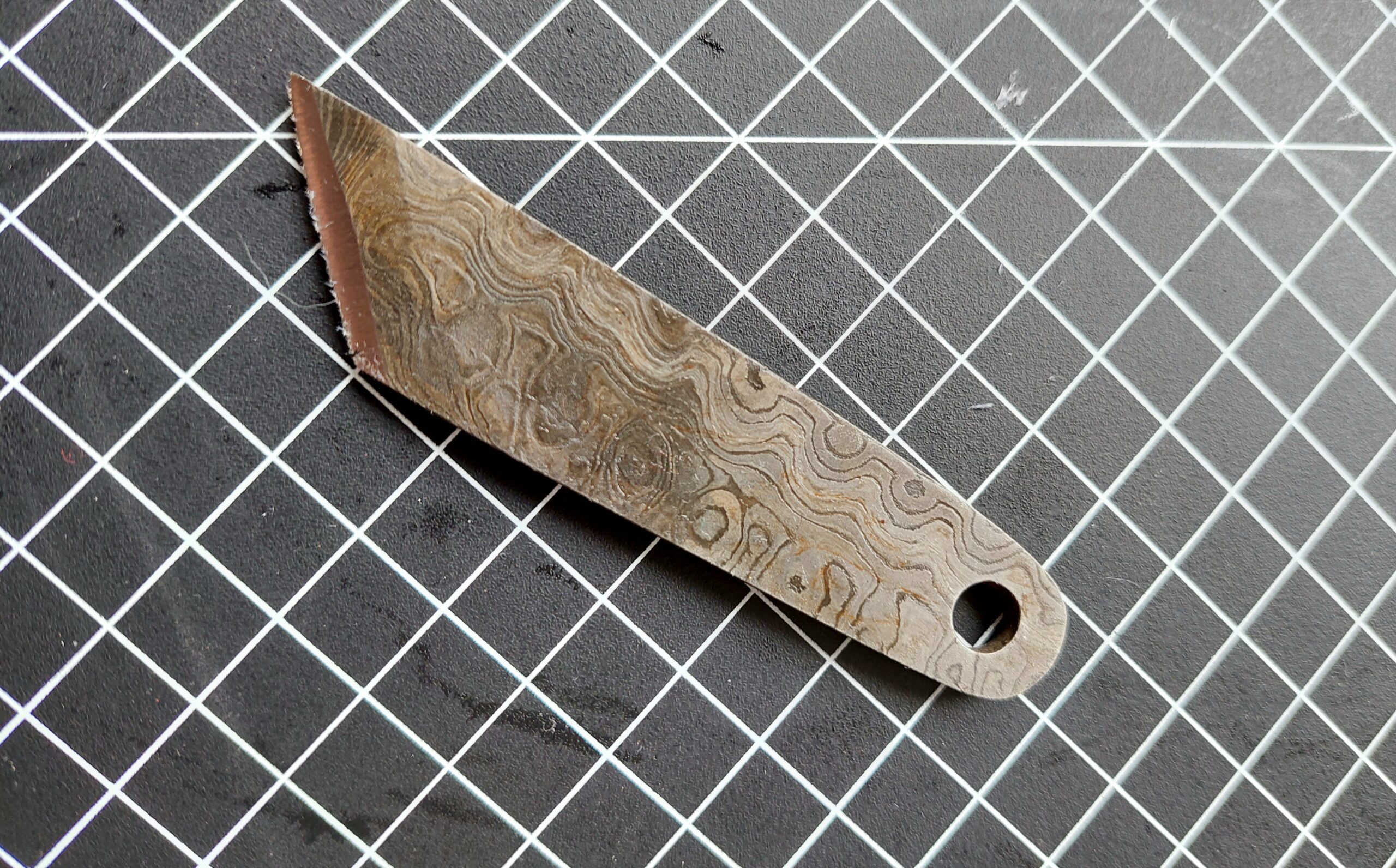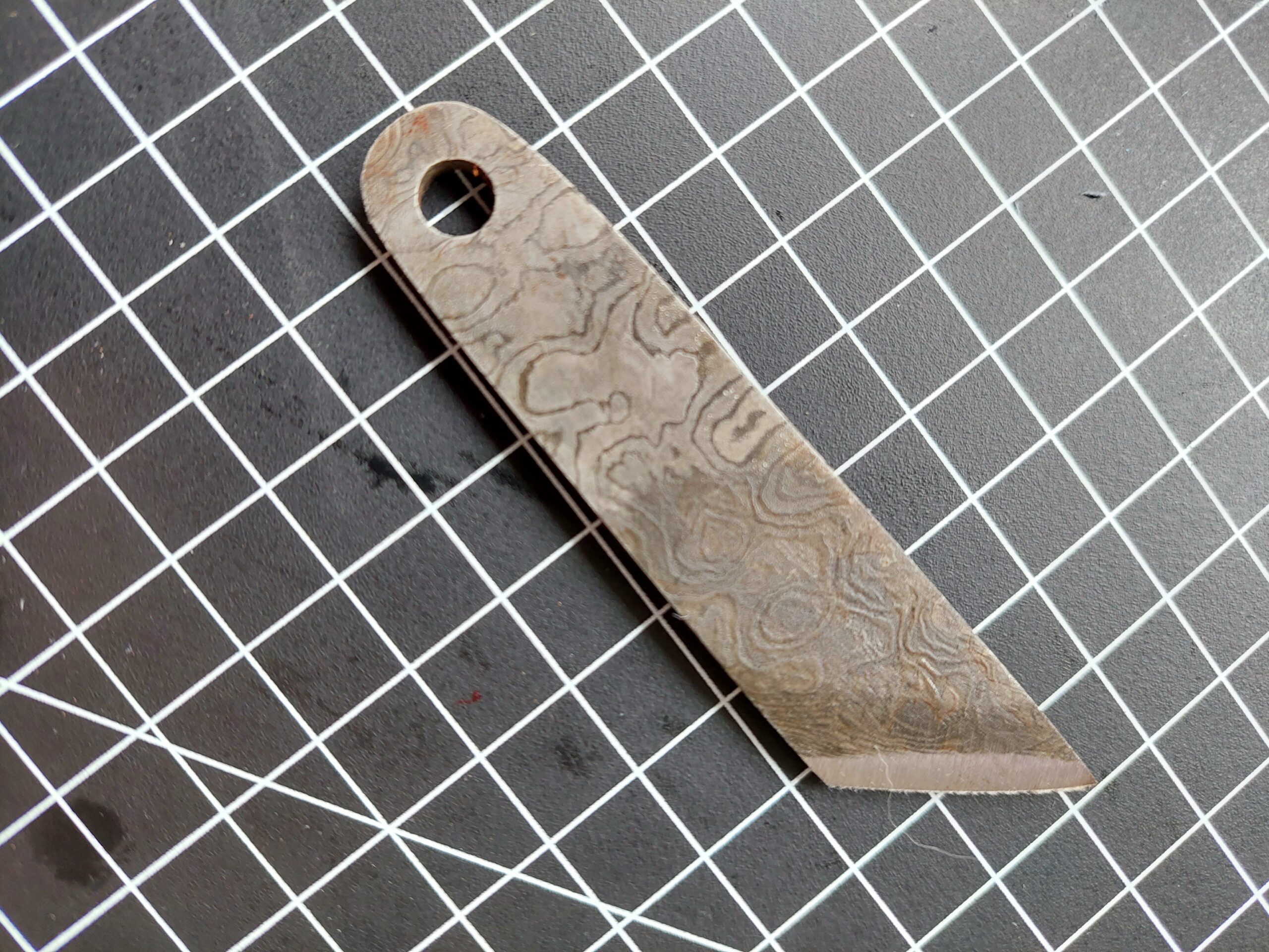 kiridashi is a Japanese term for a hobby/carving Knife this one is 8 cm long with a 2.5cm edge. Created using 1095 and 15n20 150+layer pattern welded steel. comes with a leather sheath and neck cord.