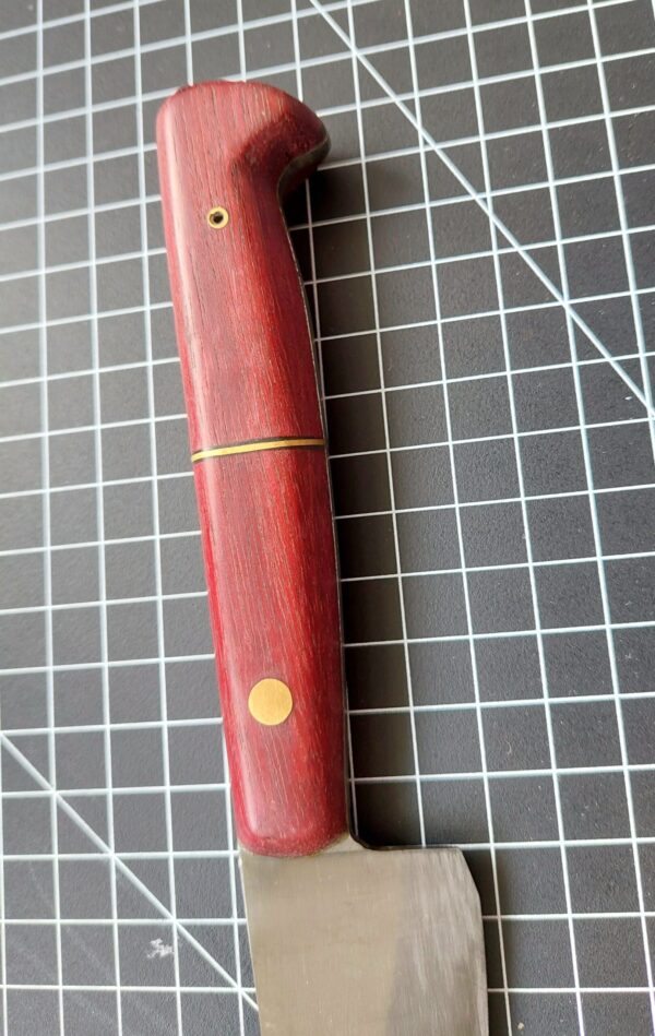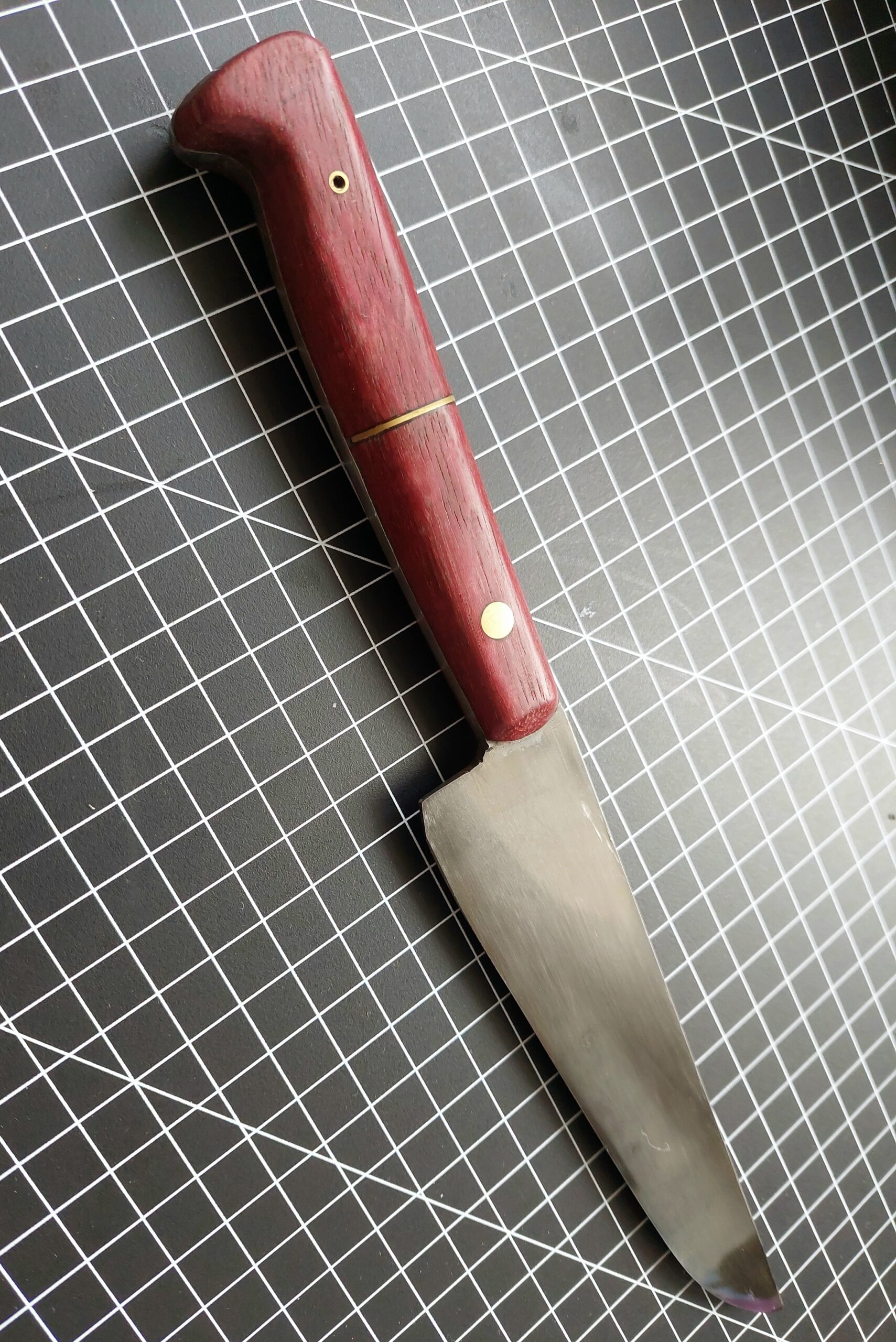 This kitchen knife is a 3mm 14cm blade and a 12cm handle. constructed using 1095 steel with an etched finish and a small hamon. the handle is purple heart with brass spacers and pins.