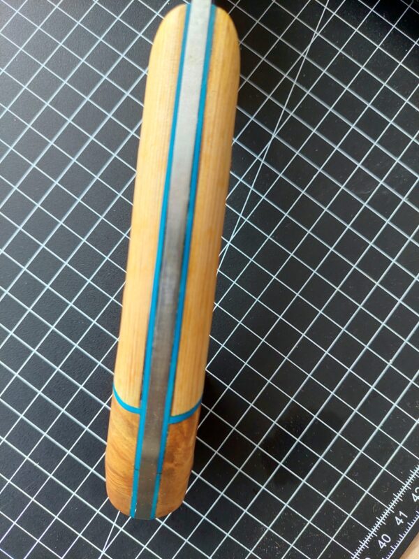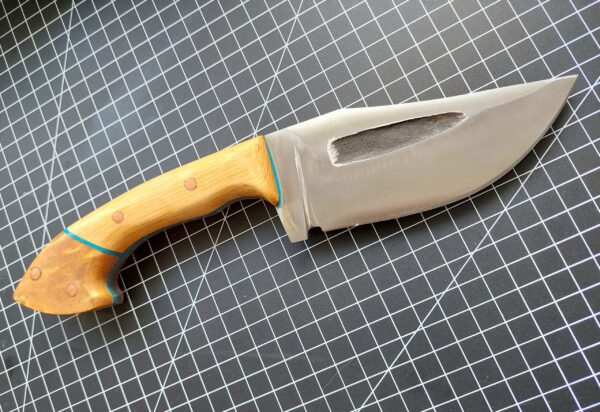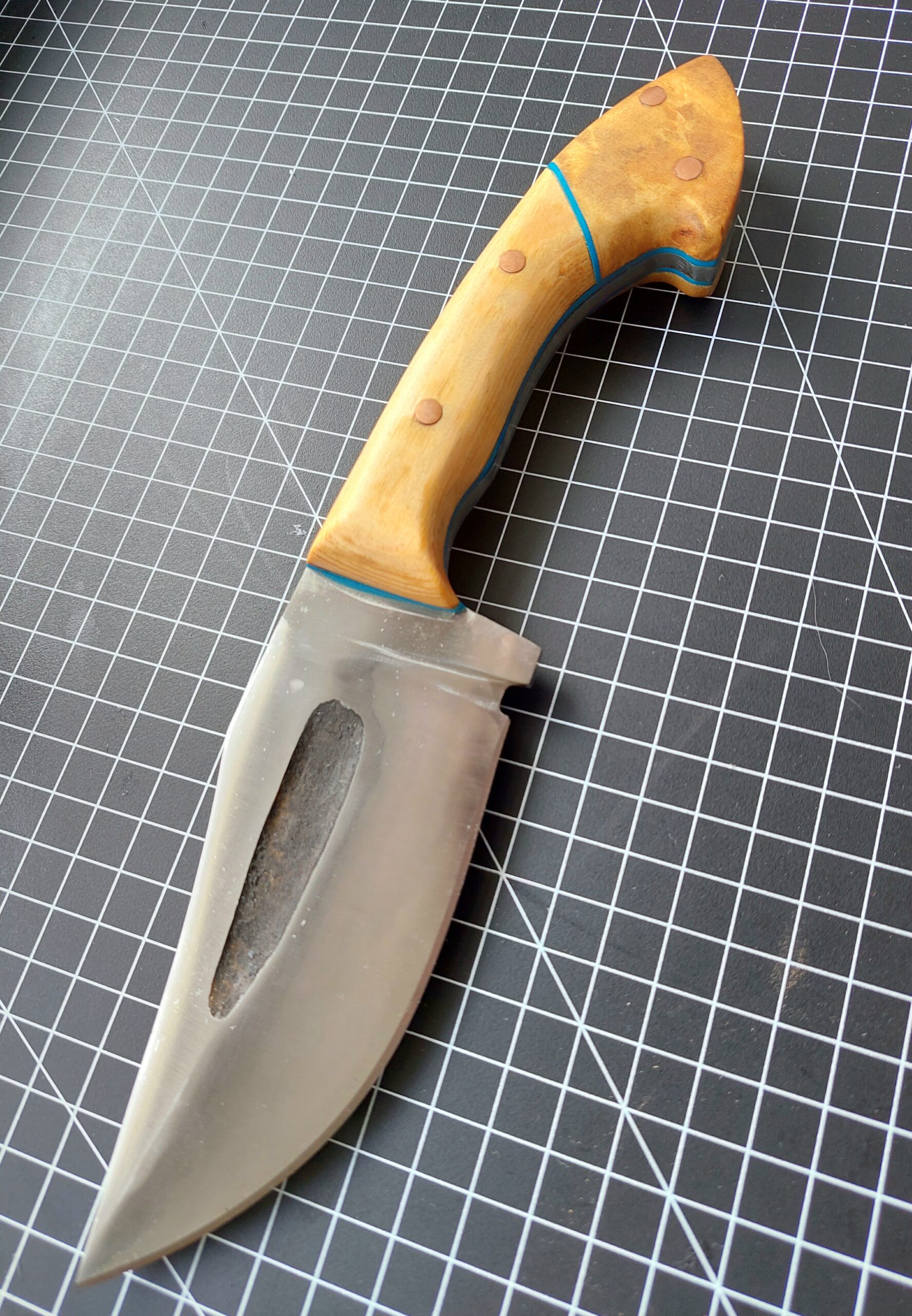 This knife is made form 1080 steel. It has a 12.5cm blade with a fuller on each side. I have hand sanded to 400g with the fullers contrasting with a forge scale left on. A 13cm handle made of maple burl and reclaimed hardwood is held with copper pins and dressed with blue g10 liners and spacers.