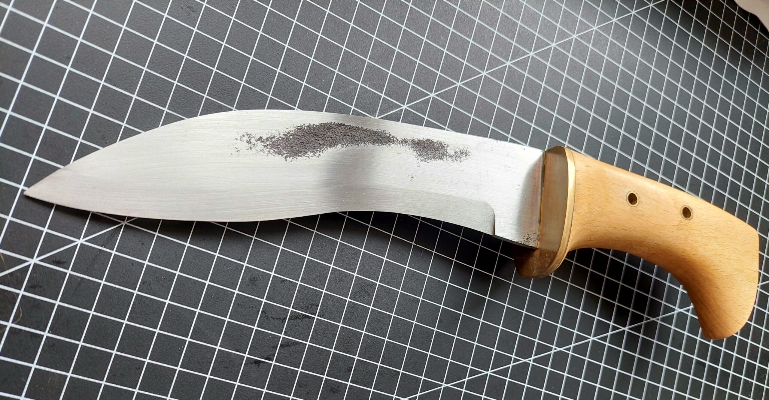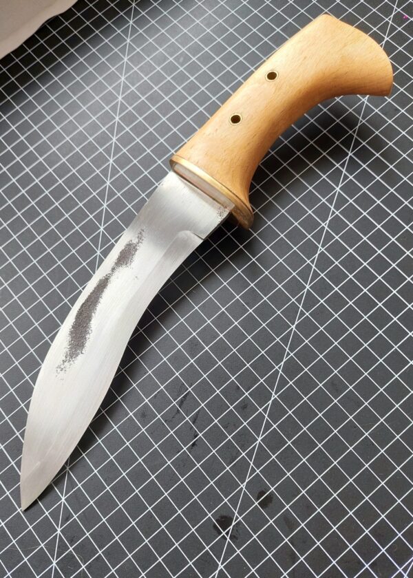 Made from 1080 3mm steel the blade is 18cm long. the handle is 11cm and is comprised of brass bolster/ tube pins and reclaimed hardwood.