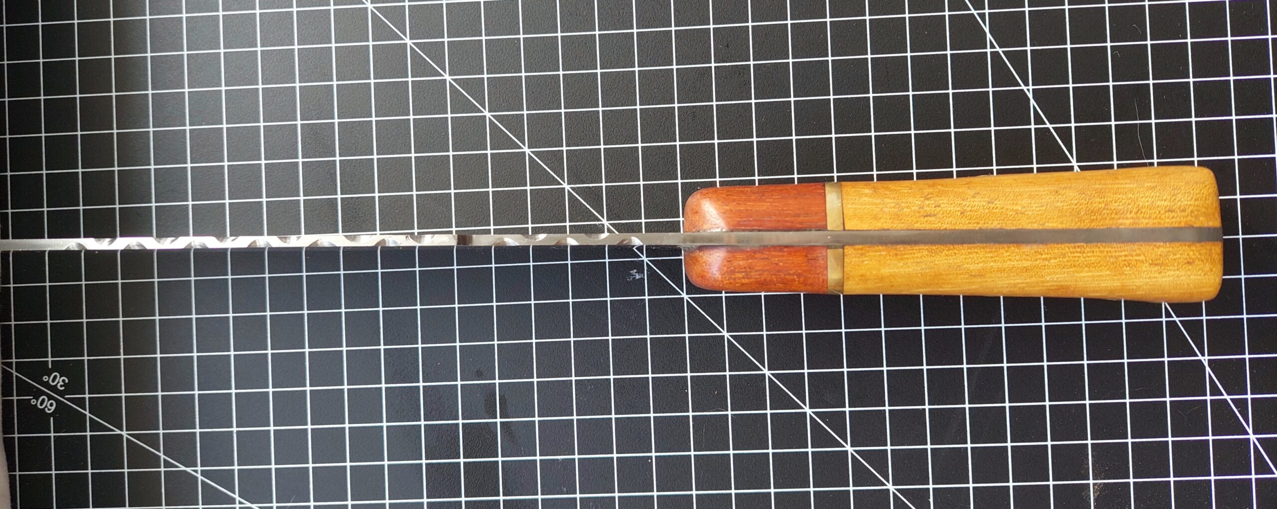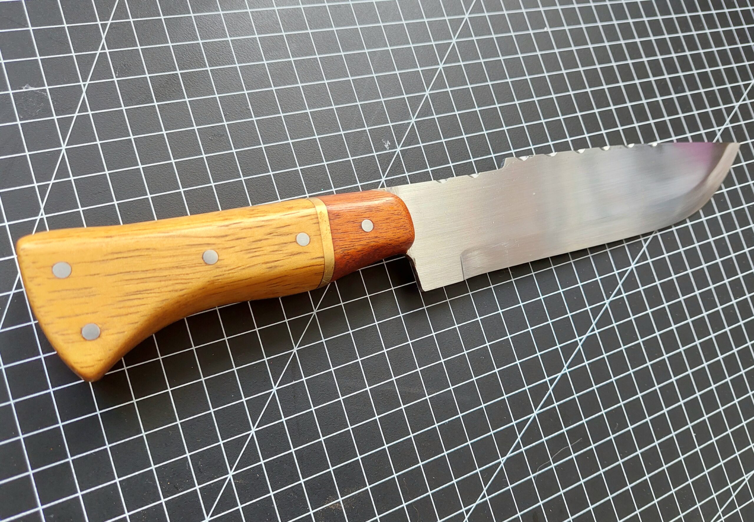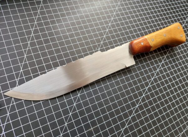 this blade is made from 3mm 1075 and has a full tang construction. Hand forged and hand sanded t0 400 grit the blade is 19.5 cm and has a detailed spine. The two tone handle 10.5cm is made from beautiful pieces of what is thought to be walnut and oak. Brass spacers and stainless steel pins add some contrast.