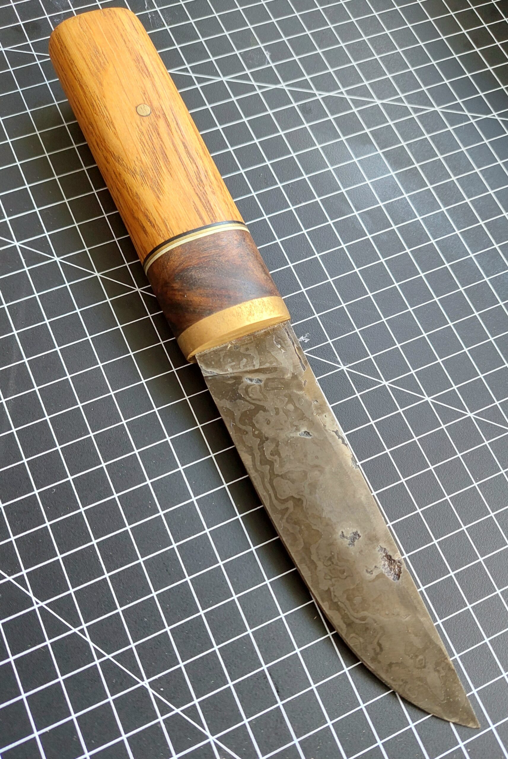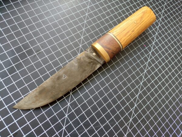 This Puukko is hand forged and has rough and ready scaring to prove it. A hidden tang design forged with 30 layers of 1095 and 15n20 and hand sanded to 400 grit. The handle has a brass bolster and pin, walnut burl, white and black g10 spacers and reclaimed hard wood. blade 12.5cm handle 12cm.