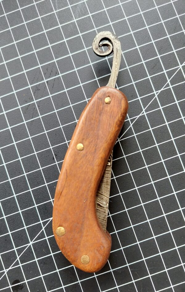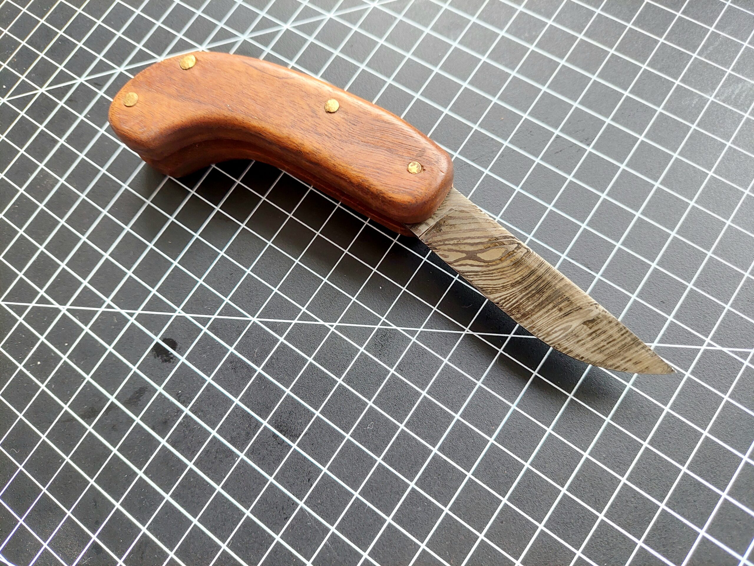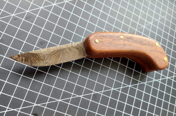 Pattern welded steel of 1095 and 15n20 above 150 layers was hand forged to create this 6cm blade. The 9cm handle is made from reclaimed hardwood with brass pins and spacers.