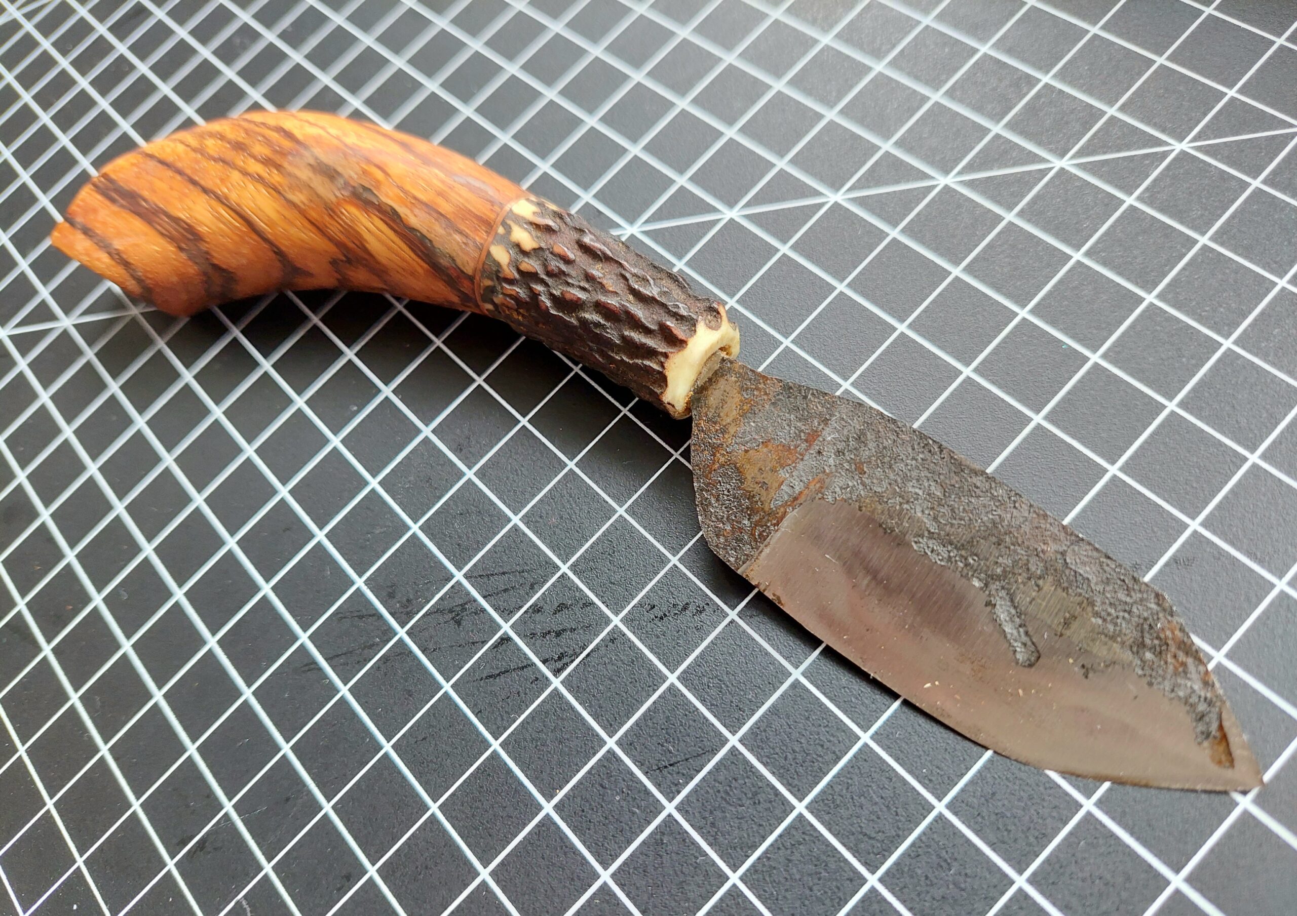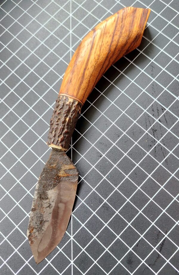 Hand made from 01 tool steel this little knife has a 6.5cm blade with the forge scale left on. The 10cm handle is made of dear antler, zebrano, and a copper spacer.
